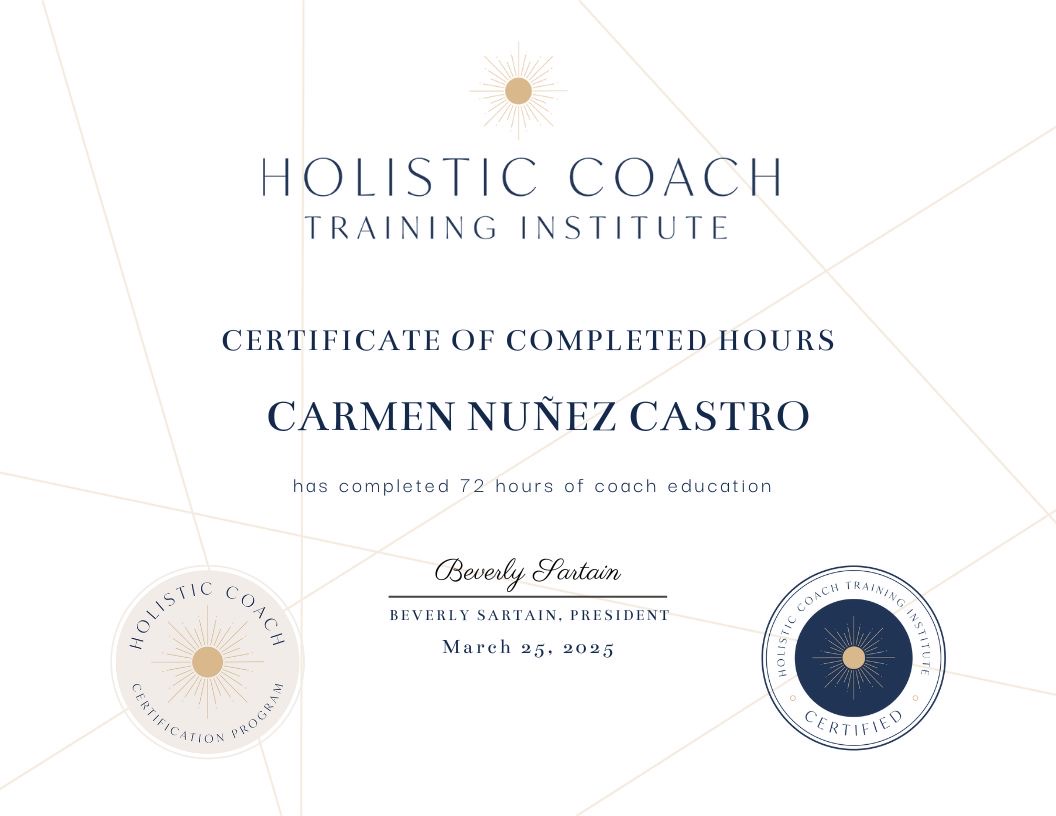 Cuento con certificaciones internacionales, como Coach and Heal Your Life Teacher, avaladas por Hay House, y Decodificador Biológico. Además, he recibido capacitación de renombrados autores y mentores a nivel mundial, incluyendo el Dr. Joe Dispenza, Enrique Bouron, Susana Majul, René Mey y el Dr. Brian Weiss.